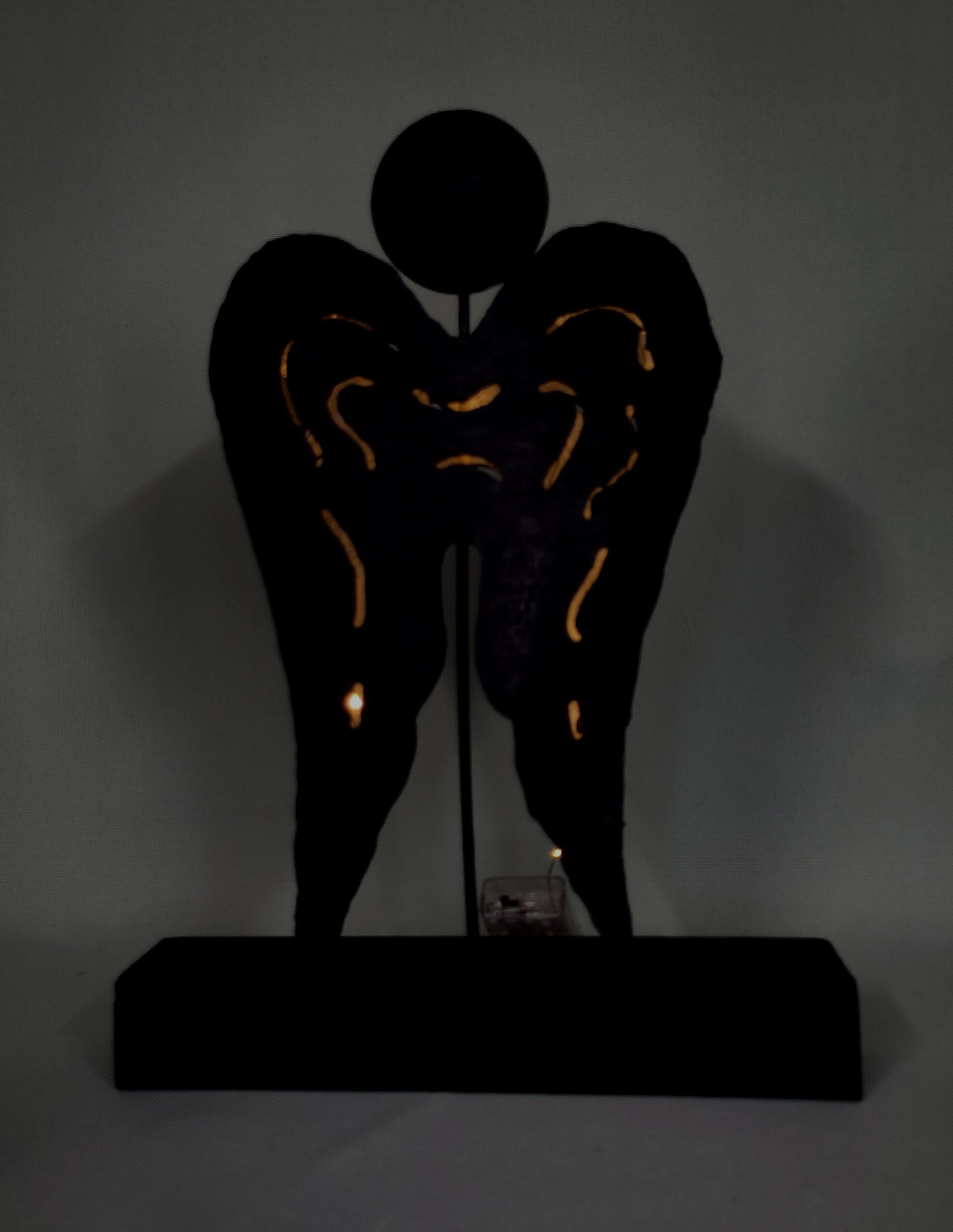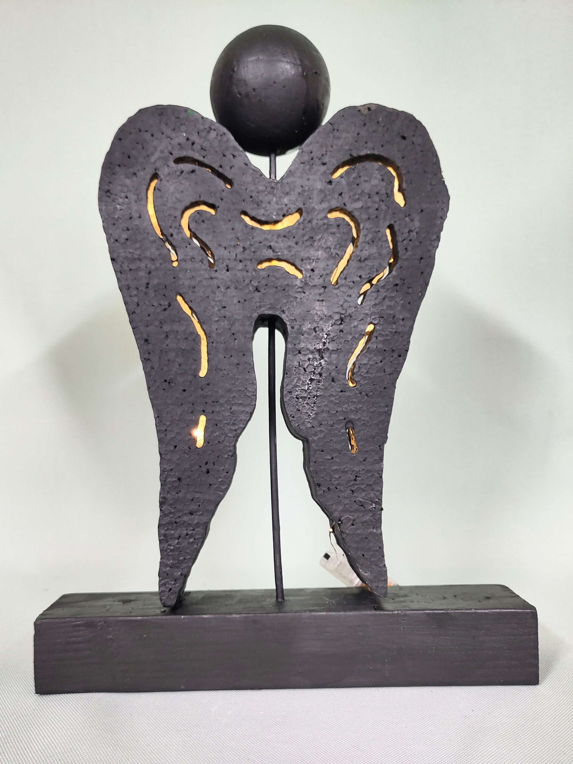 Vor dem Zusammenbau ist der Engel mehrfach innen in silber gestrichen worden. Der Rand ist nach dem Zusammenbau mit Strukturpaste abgespachtelt worden, anschließend wurde der Engel mehrfach in schwarz bemalt.